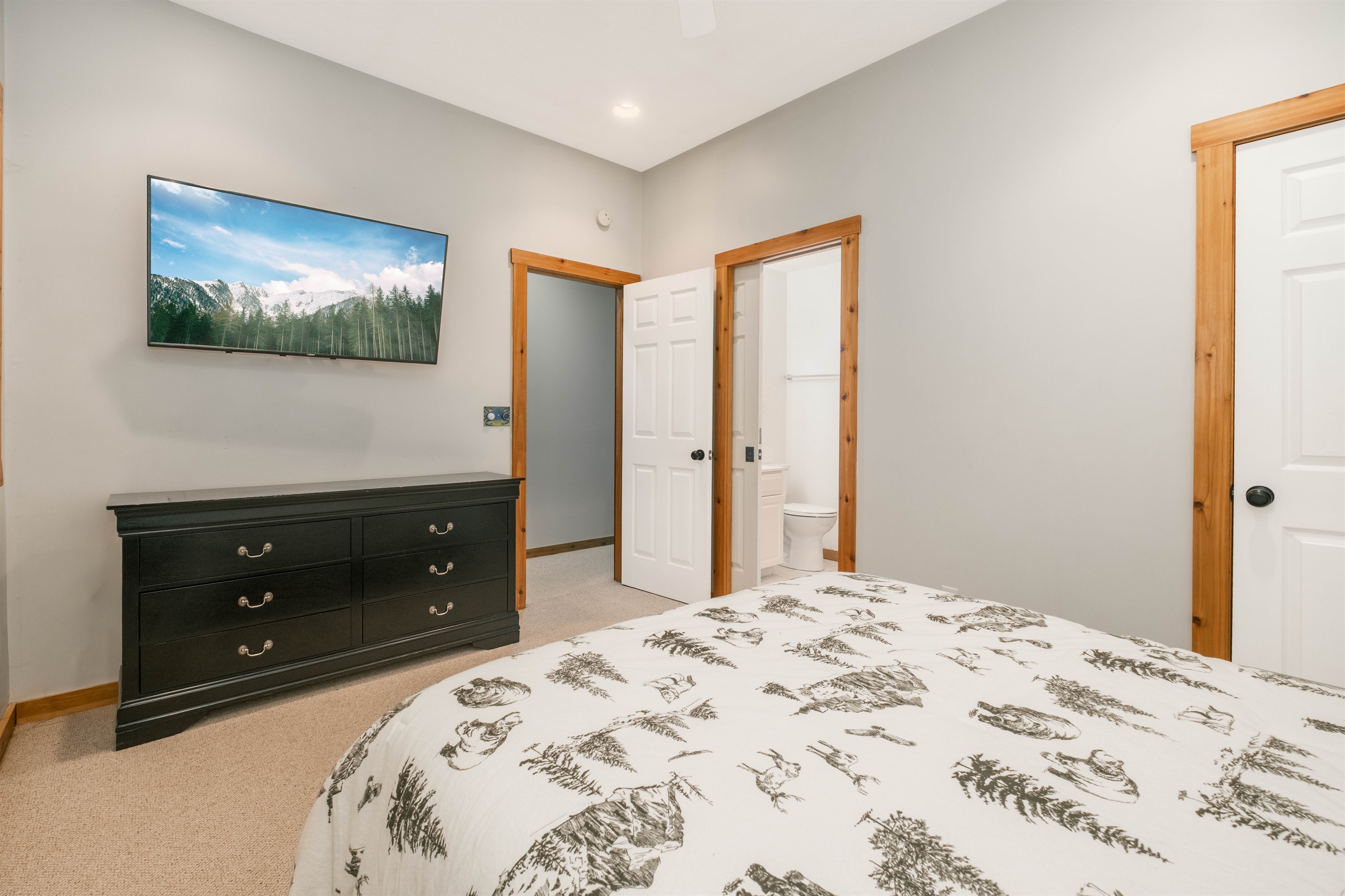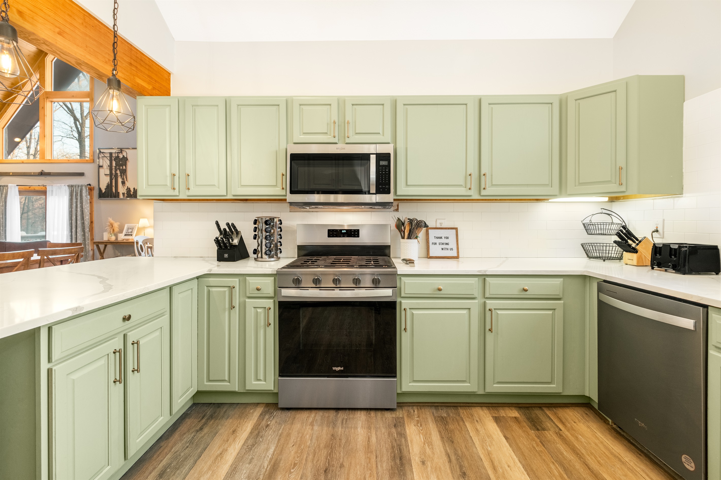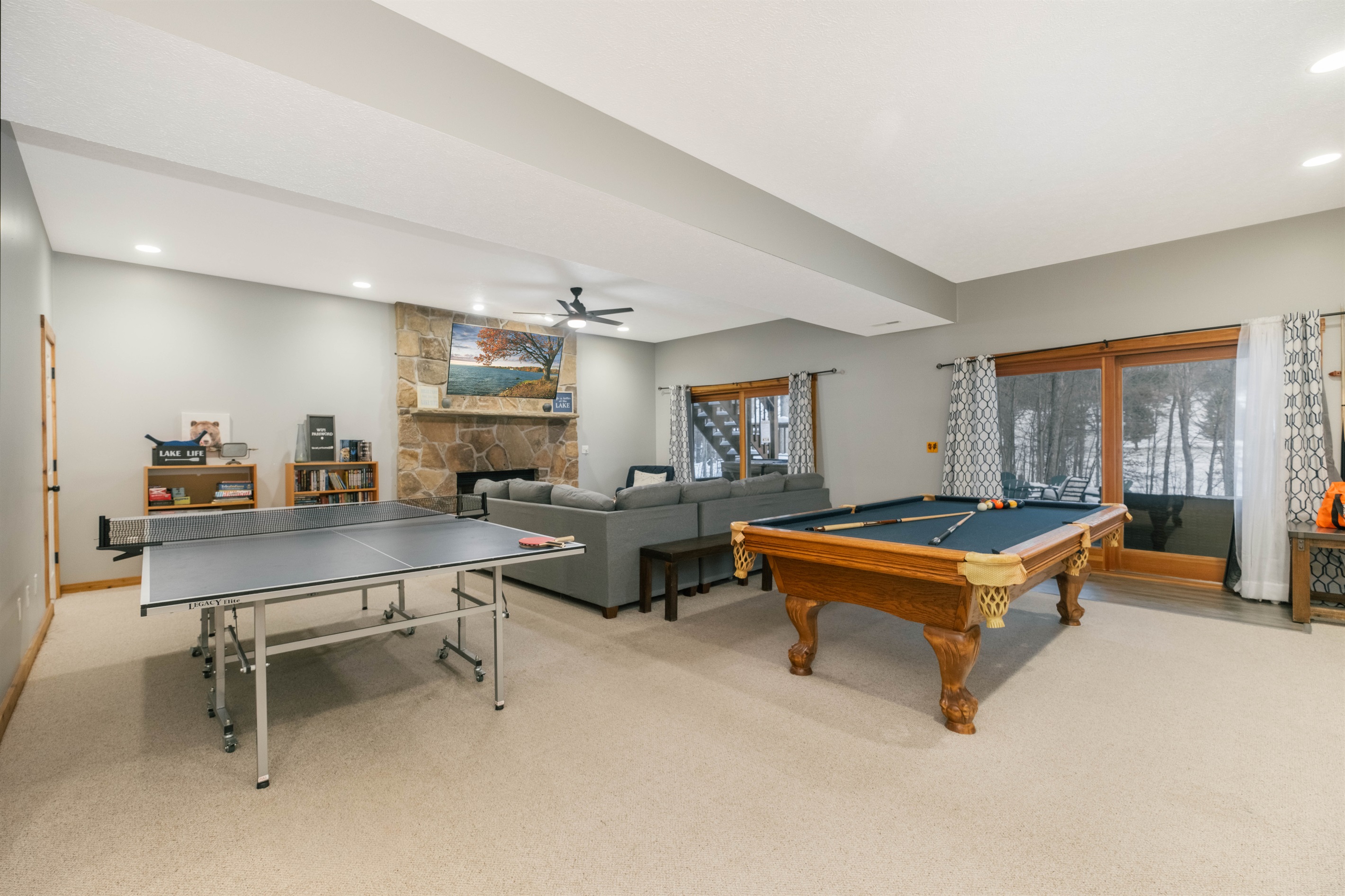 5 Bedrooms • 4 Bathrooms (3 full, 1 half) 4 Baths (3 full, 1 half) • Sleeps 8-14Welcome to Whispering Retreats! Our cabin home features 5 bedrooms, 3.5 baths, a fully renovated kitchen, and two large living areas on the main level and basement. The home sleeps up to 14 people comfortably including two king-size beds, two queens, two fulls, and two twin beds. The basement is great for entertaining featuring a pool and ping pong table and a large sectional with a large 4k TV if you wish to just relax and watch a movie. Right outside the basement is a bottom deck where you can enjoy a nice glass of wine in the hot tub.